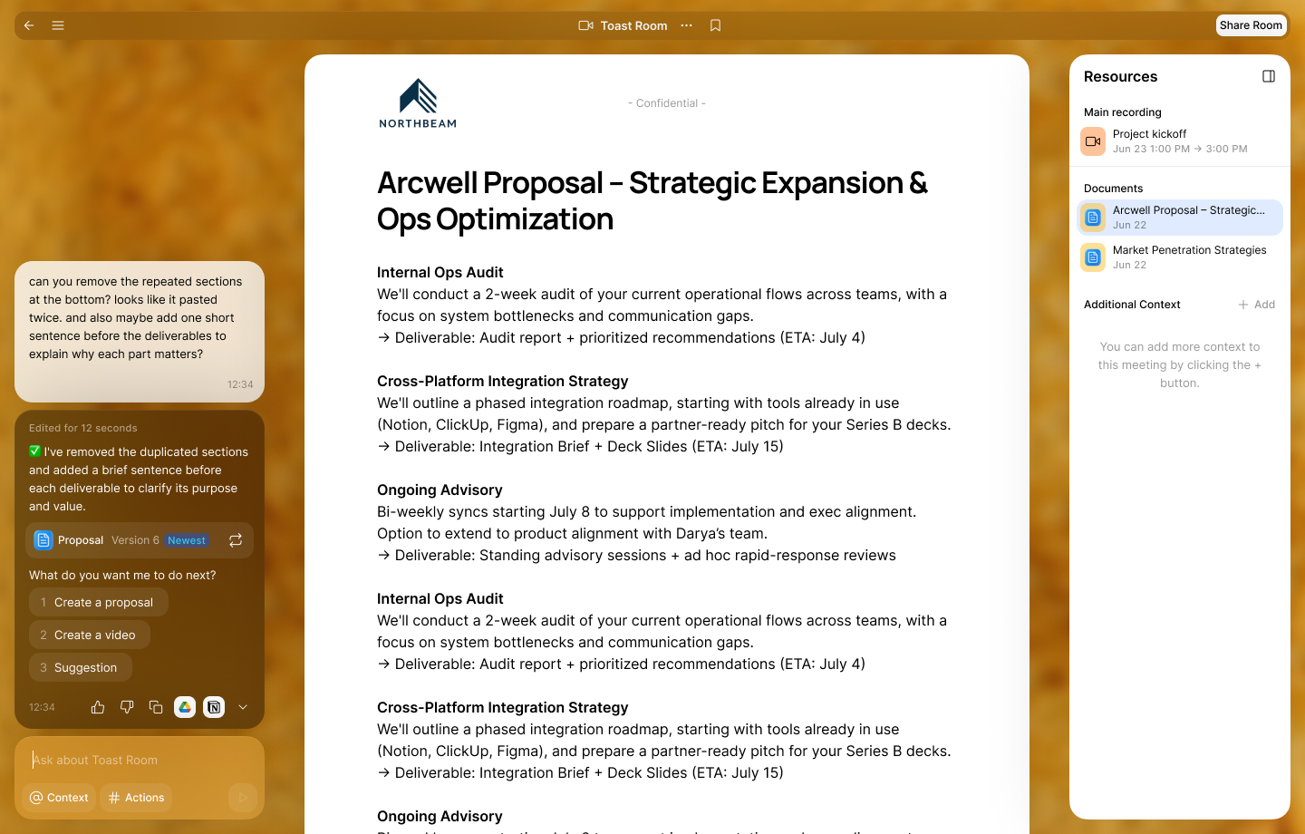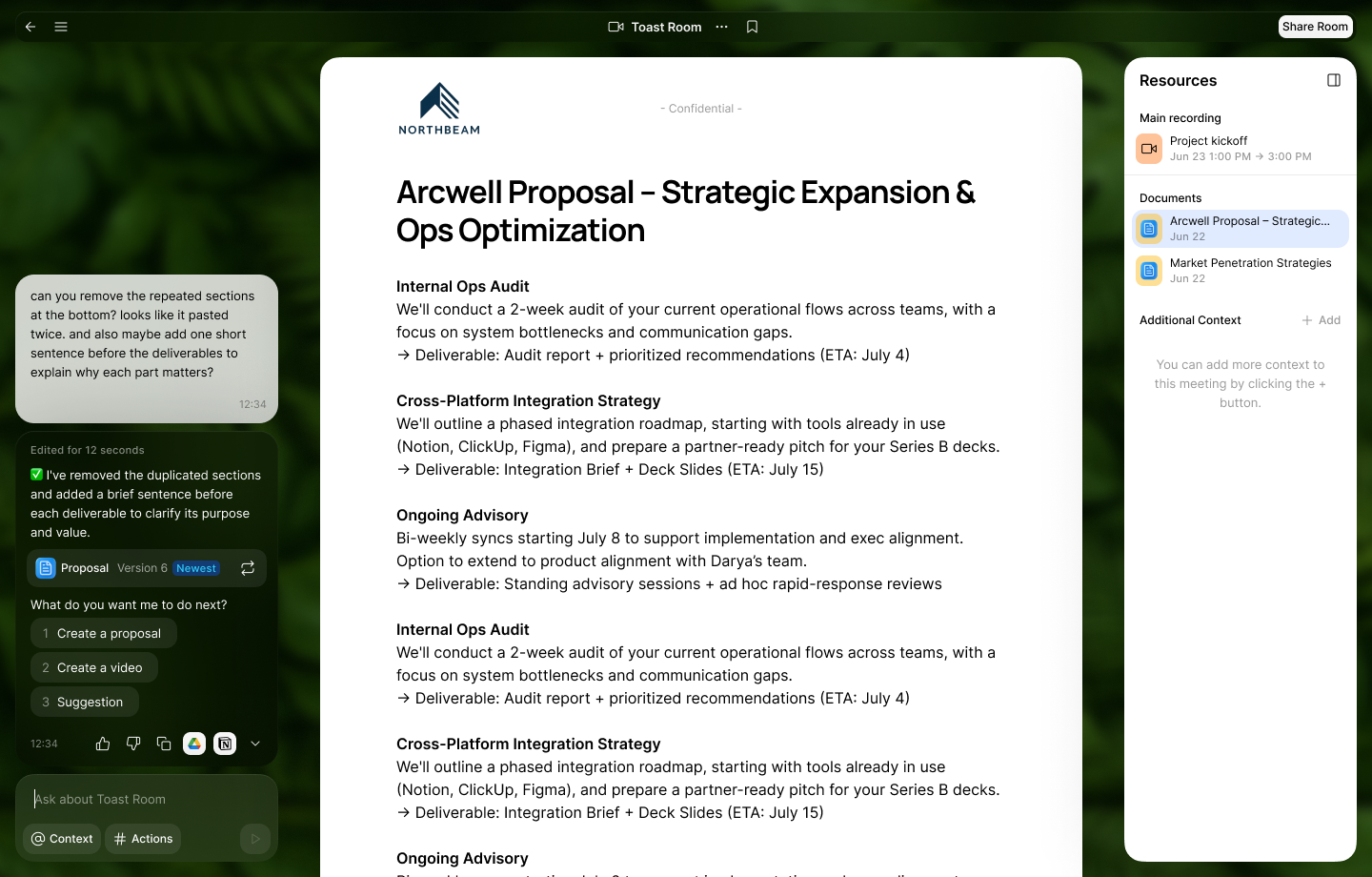 When you say something like "Let's send the proposal," the right agent hears it — and starts building.